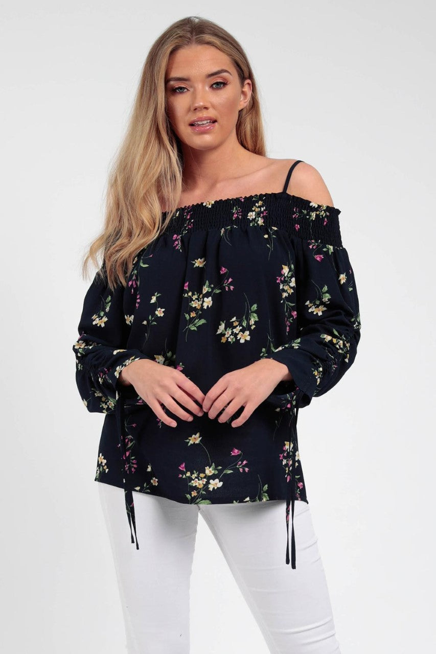 Mørk blå mønstret topp med smale regulerbare skulderbånd. Figursydd med bred vaffelsøm.