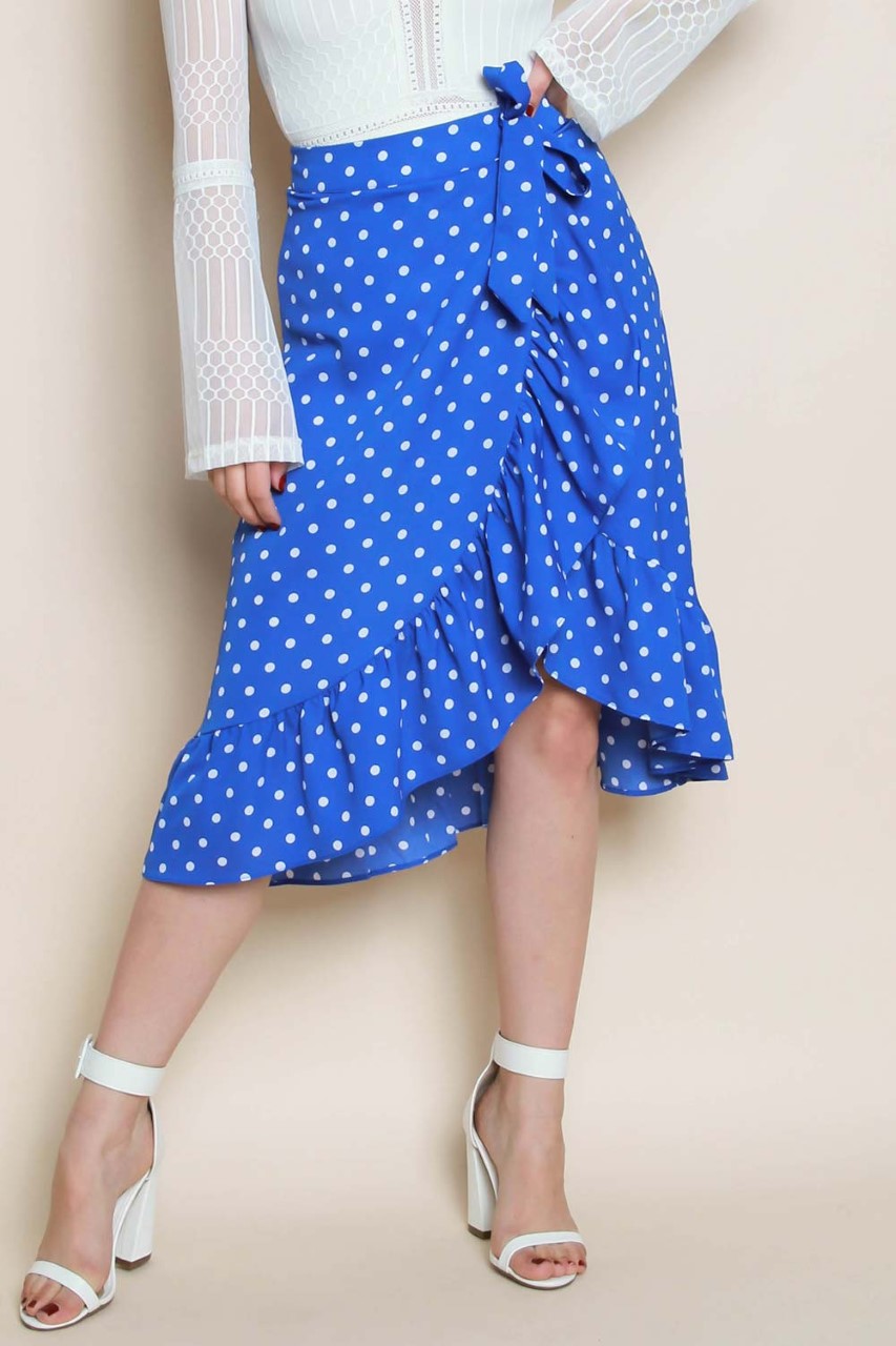 Et knelangt skjørt i polyester med mykt fall, høy midje og omslag foran. Skjult glidelås i den ene siden og asymmetrisk kant nederst.