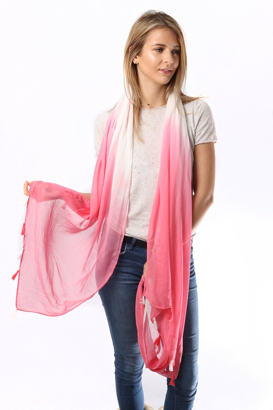 ET LUFTIG OG LETT SKJERF I HVIT OG ROSA FARGE.