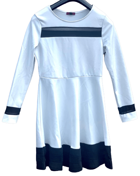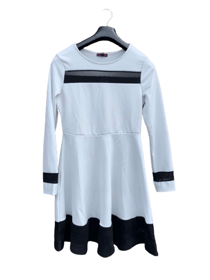 Søm i midjen og utsvingt skjørt. Kjolen er i hvit farge med sorte detaljer. Kjolen er liten i størrelse. Vi anbefaler å velge en størrelse større enn det du vanligvis bruker.
